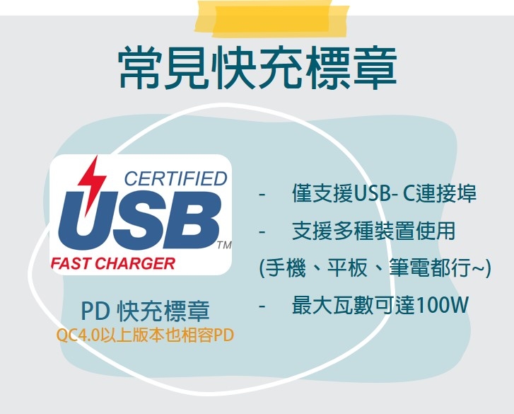2. 目前主要可支援iPhone之快充協議:常見兩款快充協議中,標示PD協議皆可以提供iPhone快速充電,若是僅標榜QC快充則iPhone有可能無法使用喔!