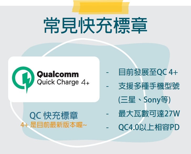 2. 大部分使用高通處理器之手機皆可相容QC快充協議,即使非高通處理器的三星旗艦機目前也支援QC,而QC4.0 及 QC 4+快充協議甚至可以相容PD快充,滿足iPhone快充所需。