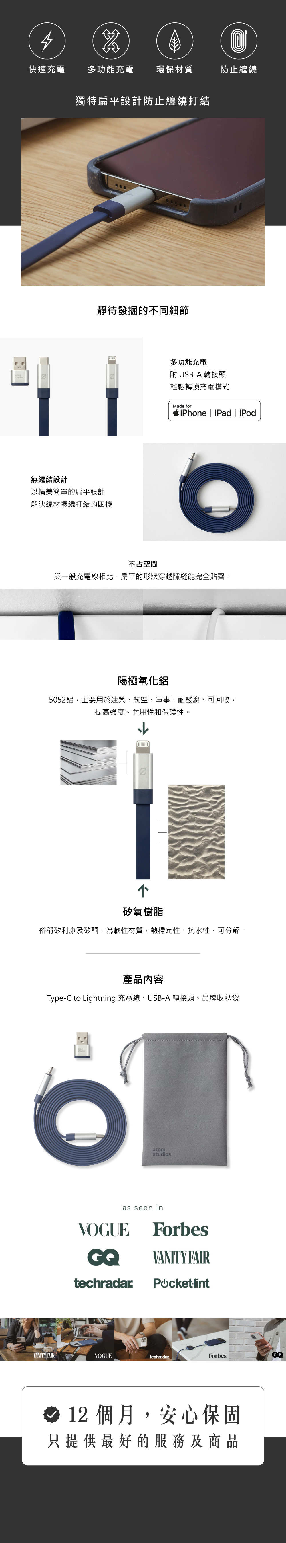 Atom Studios|1.8 M 多功能快速充電線 USB-C to Lightning (附品牌收納袋)