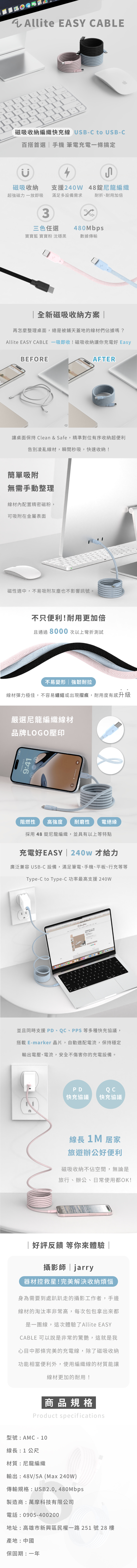 Allite EASY CABLE 磁吸收納編織快充線 USB-C to USB-C (三色可選)