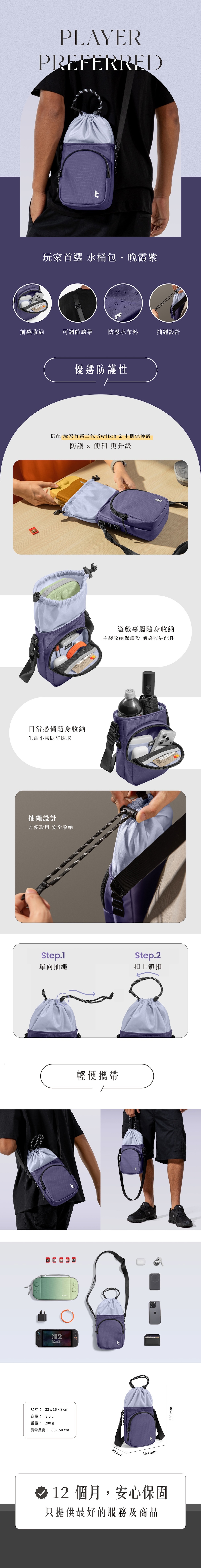 Tomtoc 玩家首選 Switch 2 水桶包 晚霞紫
