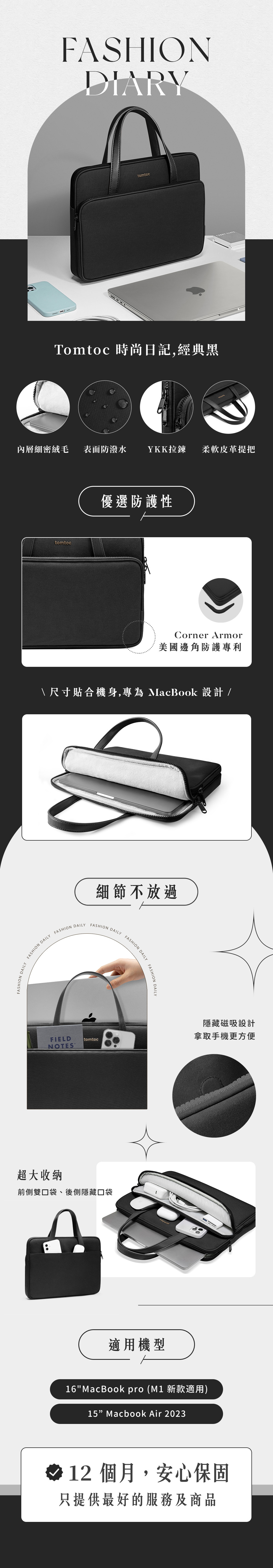 Tomtoc 時尚日記,經典黑 適用 15吋MacBook Air(M2新款) / 16吋MacBook Pro (M1新款)